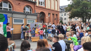 Am 28.08. hatten die beiden ersten Klassen Besuch von der Präventionspuppenbühne der Polizei. Spielerisch und interaktiv wurde das richtige Verhalten im Straßenverkehr thematisiert. Gemeinsam mit der Handpuppe Freddy lösten die Kinder Aufgaben. So konnten sie etwas über die Farben der Ampel, das richtige Überqueren einer Straße oder die passenden Farben der Kleidung lernen. Am Ende wartete ein Schatz, über den sich alle Erstklässler sehr gefreut haben.