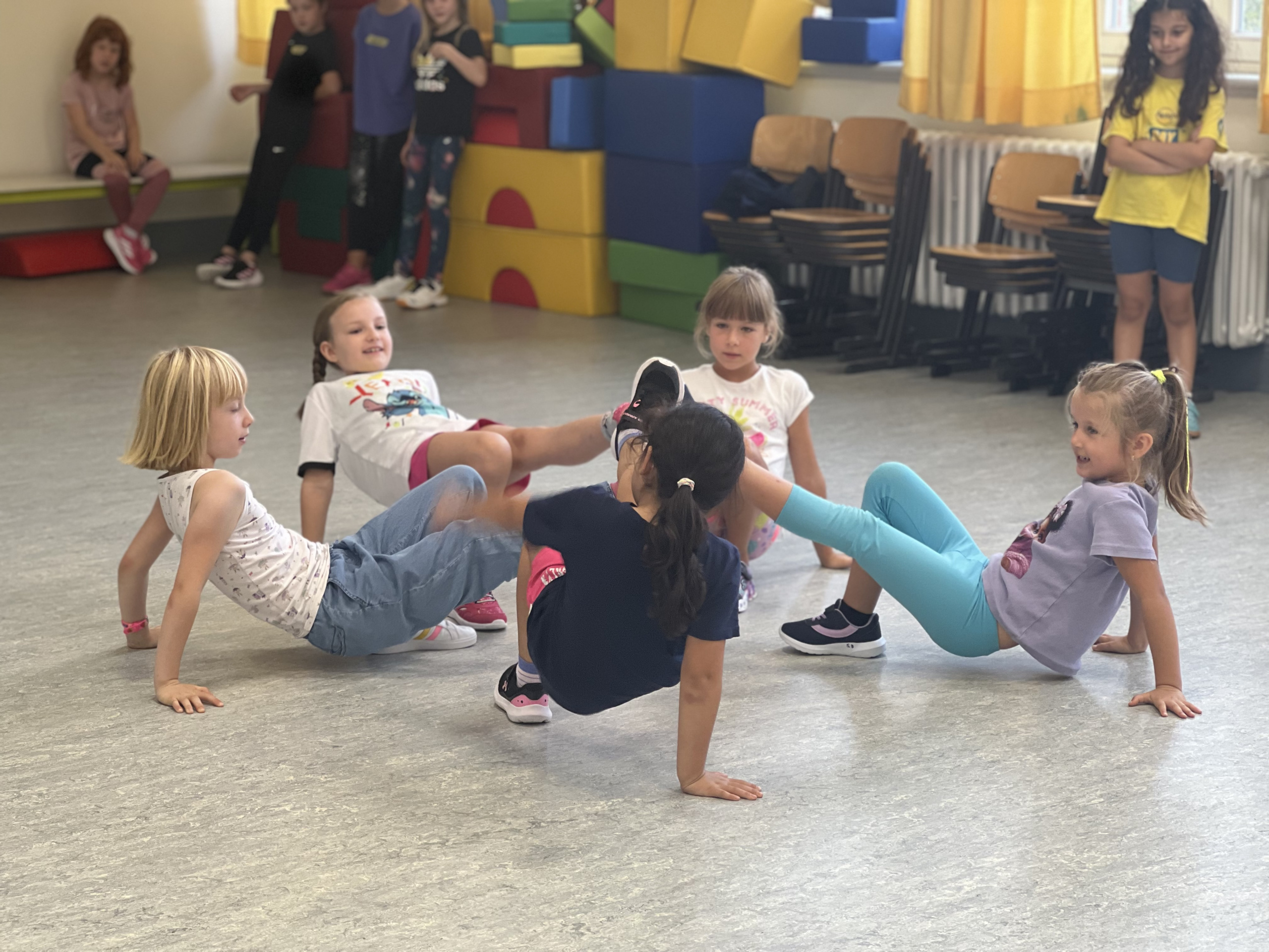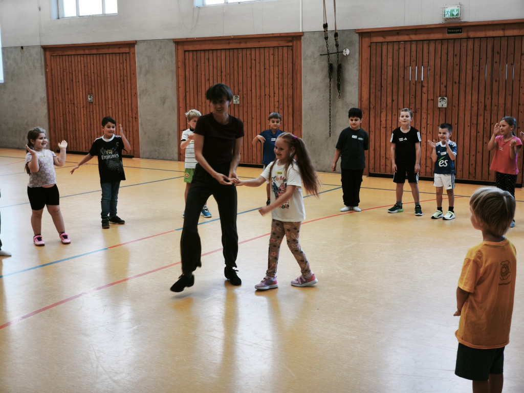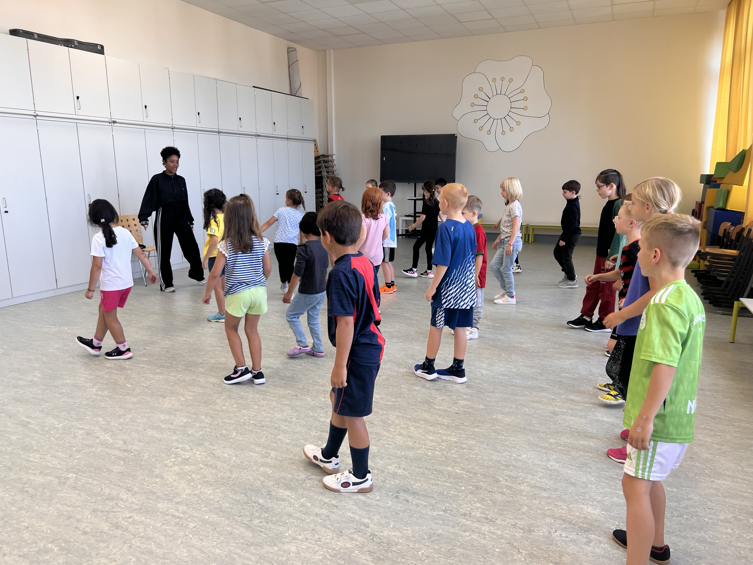 Heute startete unsere Projektwoche. Das Tanzen hat allen Klassen sehr großen Spaß gemacht. Neben dem Tanztraining gibt es für alle Klassen weitere tolle Angebote. Auf dem Schulhof bauen wir beispielsweise einen Barfußpfad aus nachhaltigen Materialien. Auf den Bildern sind Eindrücke vom Tanztraining unserer Otterklasse (1c).