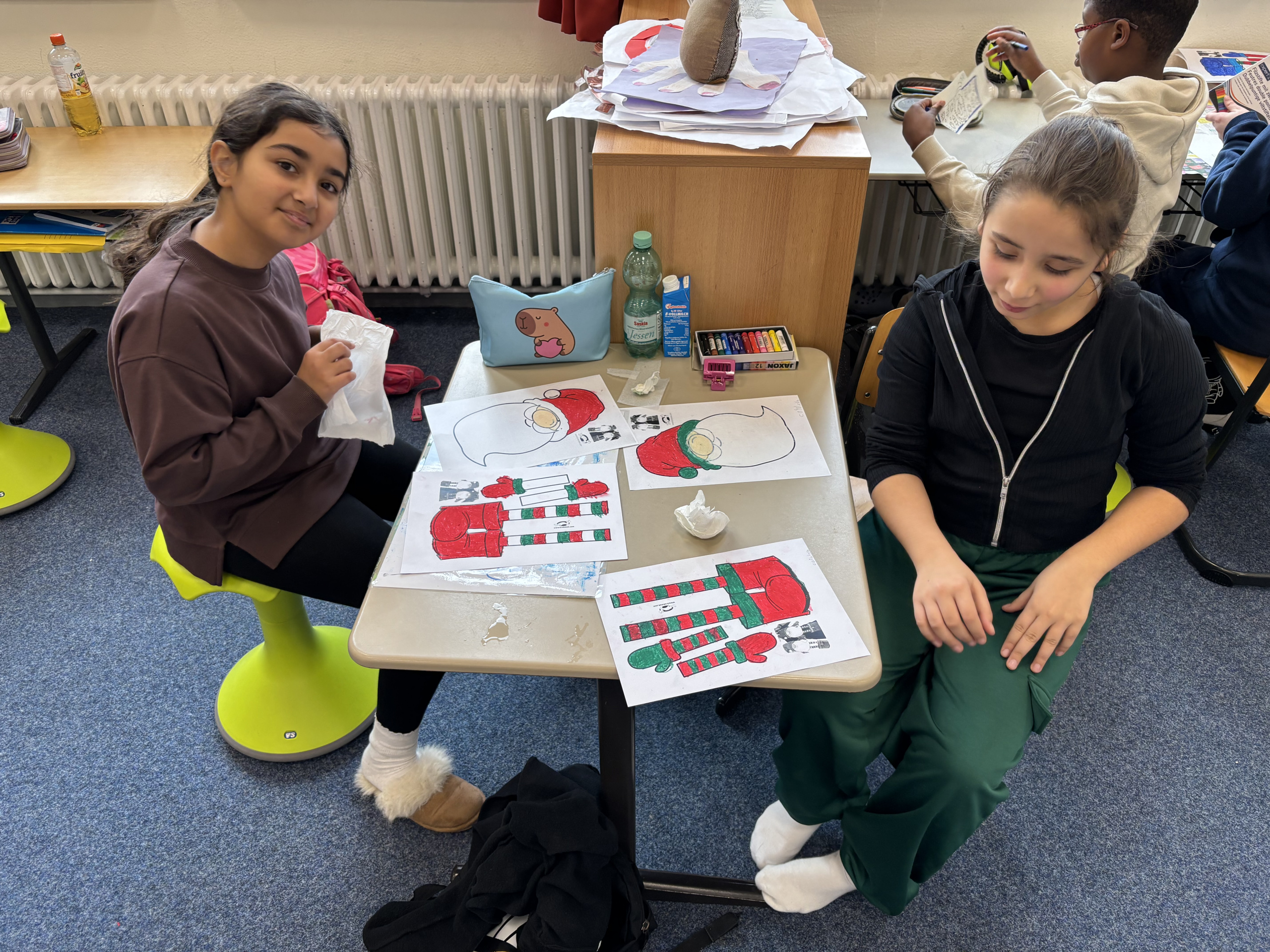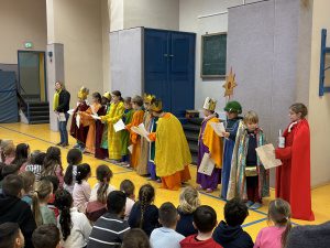Am 13.12., dem Tag der heiligen Luzia, ist die Klasse 3b mit einer verkleideten „Luzia“ singend durch alle Klassen gezogen und hat dort Kekse an alle Schulkinder verteilt.